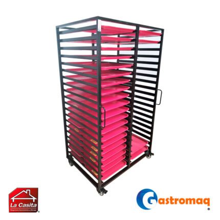 - Este carro bandejero de doble columna es la solución perfecta para transportar y organizar grandes volúmenes de bandejas en panaderías, pastelerías y cocinas industriales. Diseñado para bandejas de 60×40 cm, ofrece máxima capacidad y resistencia.