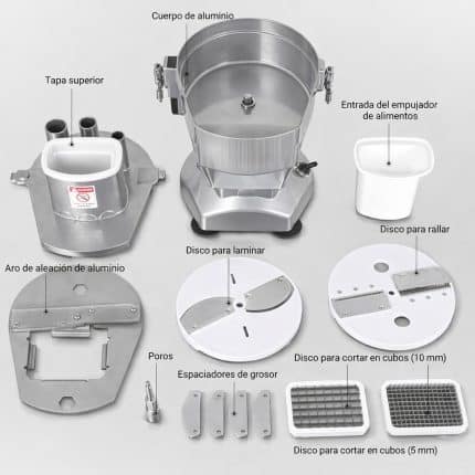 - Optimiza el procesamiento de alimentos con este potente procesador de vegetales industrial de 19 litros, diseñado para negocios gastronómicos que requieren alta eficiencia y precisión. Equipado con un motor de alto rendimiento que procesa una amplia variedad de vegetales en segundos, garantizando rapidez y uniformidad en cada preparación.