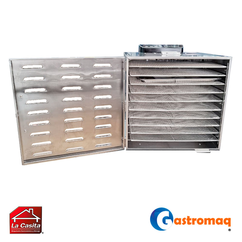 - El Deshidratador Sobremesa 10 Bandejas Gastromaq ofrece un secado uniforme, eficiente y profesional gracias a su sistema de flujo de aire horizontal, similar al de un horno de convección. Su diseño compacto y robusto, con estructura de acero inoxidable, garantiza higiene, durabilidad y resistencia a la corrosión, ideal para uso continuo en la elaboración de alimentos deshidratados.