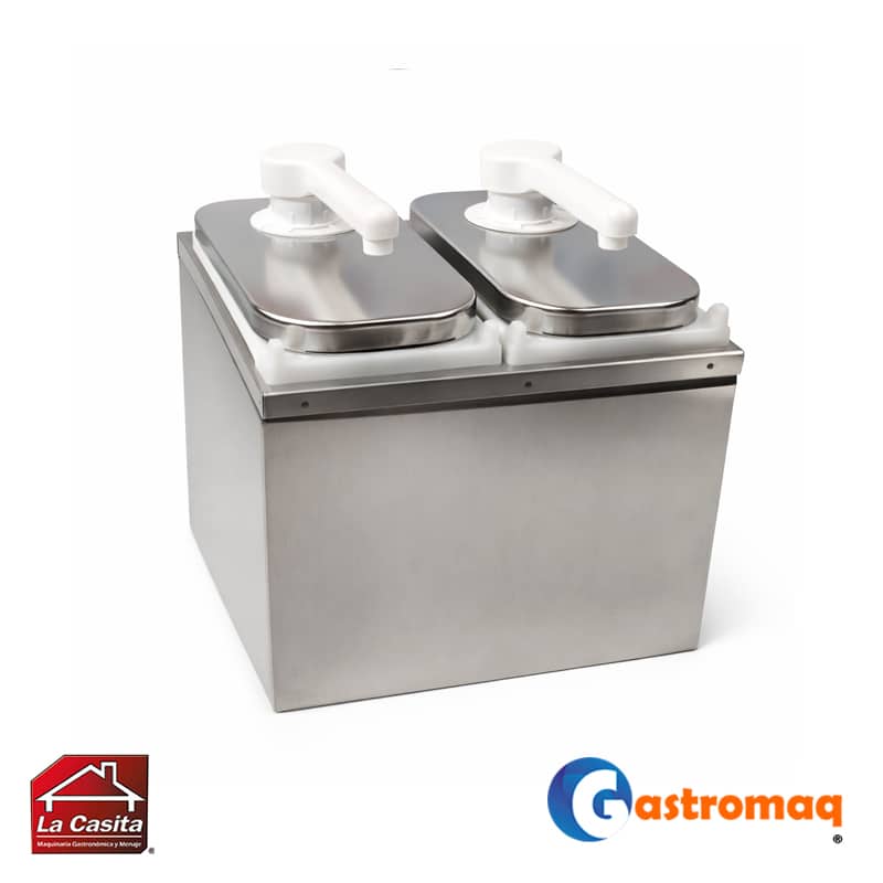 - Dispensador Salsa Acero 2 Depósitos 4 lts. Toppo Gastromaq diseñada para optimizar el espacio y la eficiencia en líneas de preparación de alimentos. Cuenta con dos bombas independientes de alta precisión montadas sobre una estructura de acero inoxidable unificada. Su diseño hermético protege las salsas del contacto con el ambiente, prolongando su frescura.