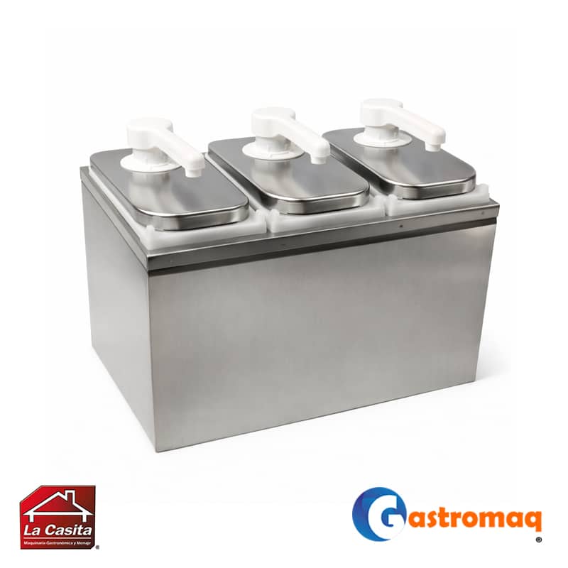 - Dispensador Salsa Acero 3 Depósitos 6 lts. Toppo Gastromaq, ideal para puntos de venta con alto flujo de clientes. Permite centralizar los tres aderezos principales en una sola unidad compacta y robusta. Su sistema de triple bombeo manual garantiza una higiene superior al evitar el contacto directo del usuario con el producto o el recipiente original.