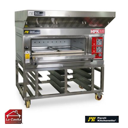 El modelo U HPK-1 D de Pareti-Kitchenette® es un horno tradicional de piso chileno, llevado a su máximo nivel de calidad para satisfacer hasta el más exigente de los panaderos, a diferencia del modelo tradicional HPK, este modelo está equipado completamente en inoxidable para mayor higiene y durabilidad, además este modelo cuenta con un cierre mejorado de puertas por sistema de cadena y posee un burlete en su puerta para disminuir la perdida de calor. Los hornos de piso se encuentran diseñados para tener una o más cámaras de cocción, además de tener dos quemadores independientes por cámara, con regulación independiente en cada quemador lo que permite hornear a diferentes temperaturas, haciendo de este un producto versátil y diferenciador de otros hornos.